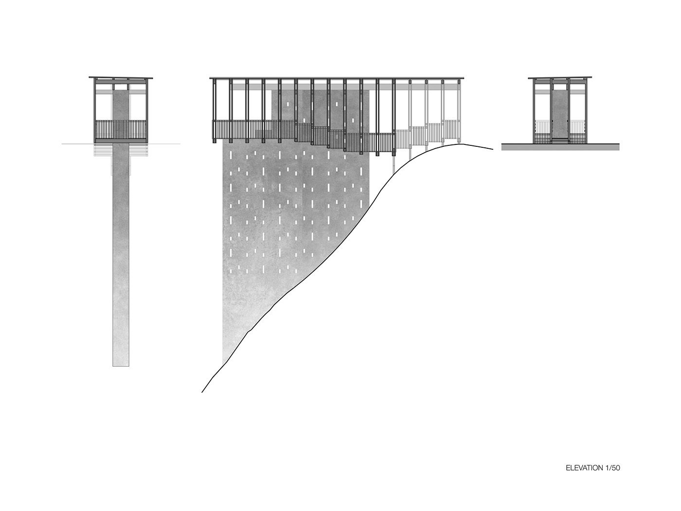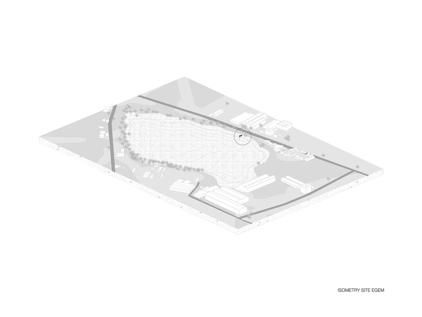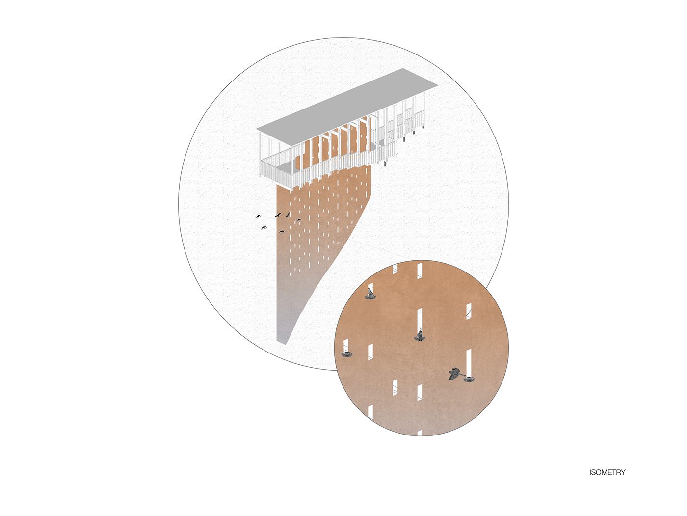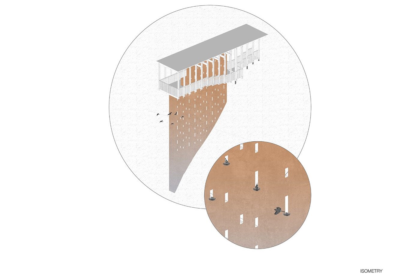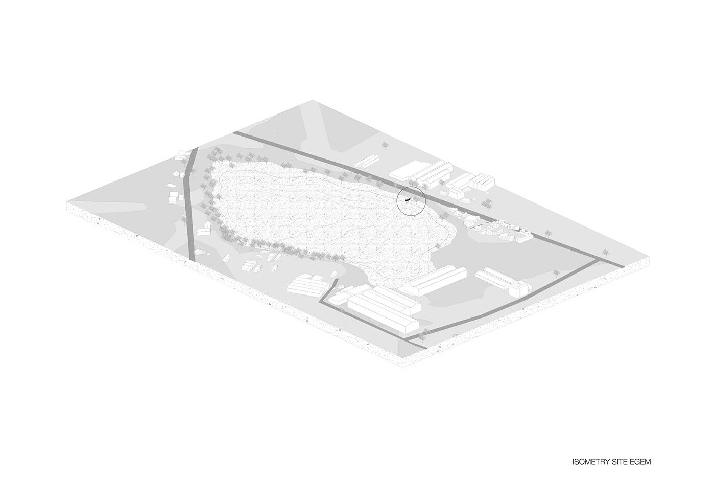 The Egemse clay pit and stone bakery are abandoned since 2011. The purpose of the province of West Flanders is to make the site a public green area, with recreative activities in the reconverted industrial surrounded buildings. Further, the clay pit will be partially filled, to give nature a chance to develop apart from the swamp area. WAL[L]K is a 1m thick rammed earth wall of 20m high coming out of a hill. At the top, it offers walkers the wide view into the inaccessible clay pit. At the bottom, it offers bird species nesting holes. These holes are formed by perforations through the wall, as a result of the rammed earth formwork. Some perforations are filled with wooden beams, to create platform stairs. WAL[L]K is accessible at the street level, located on the walking route around the clay pit. This walking dynamic to sense nature is continued in the circulation route. When entering the wooden construction, the walker descends with stairs that follow the hill. This continues into a split where the route can go left or right from the rammed earth wall. Rising stairs bring the walker to the viewpoint, from there the route makes a loop back to the entrance. WAL[L]K is made from grey clay and crushed red bricks waste. Both are found at the building site itself. The foundation in the hill is constructed with rammed dry concrete. The concrete is proportionally added to the rammed earth mix to create a smooth gradient transition. WAL[L]K received his form in a functional way, one thick wall was a clear solution to cover the 20m pit height. Additionally, it aligned with the conceptual principle, a purified simple structure made a modest and subtle approach possible towards nature. The light wooden construction follows the same modest approach because of deduplicated columns.