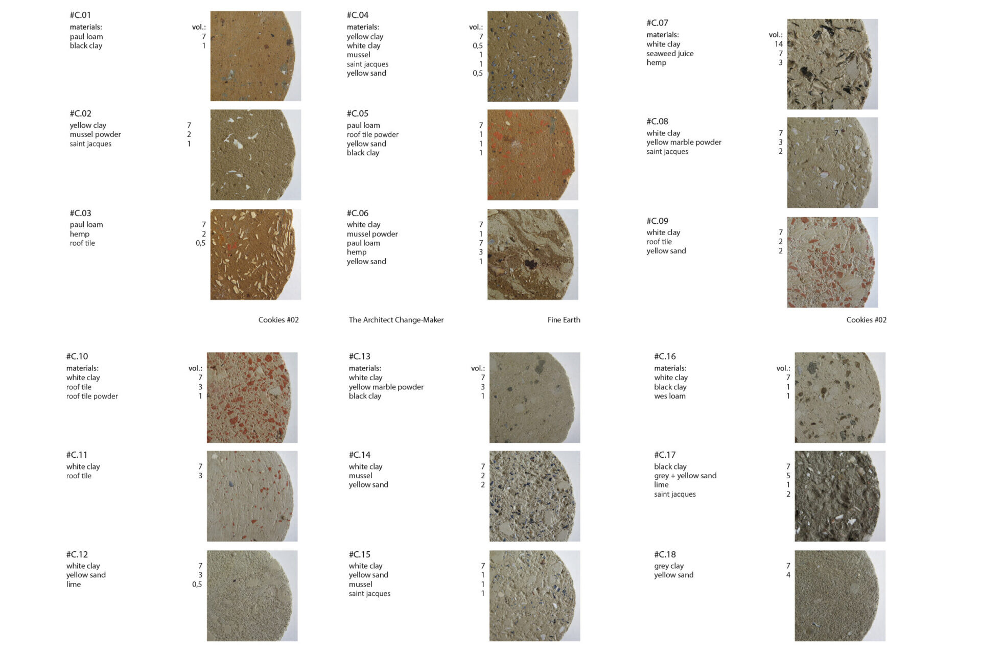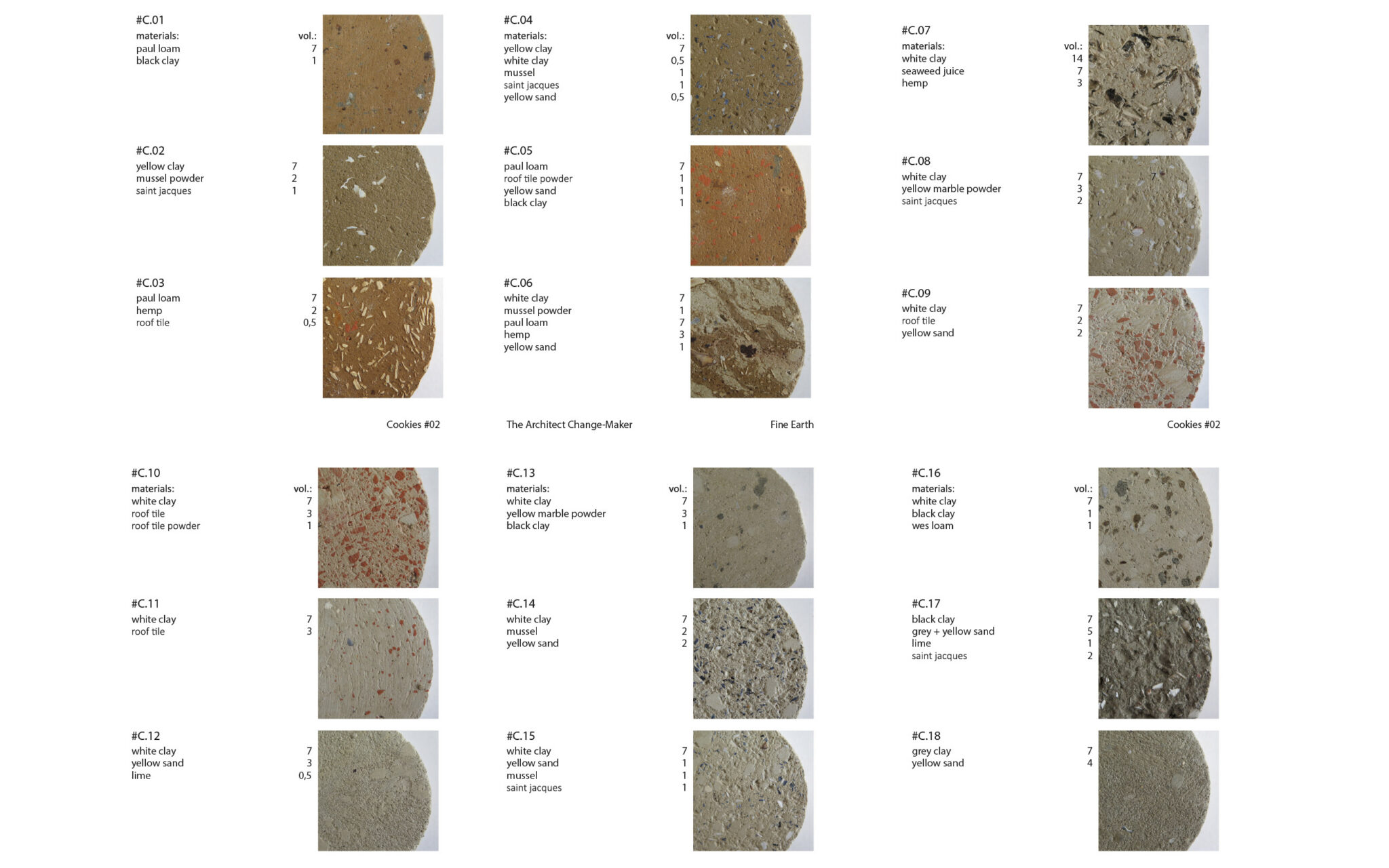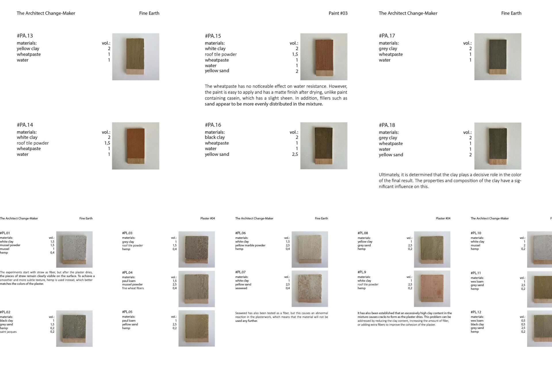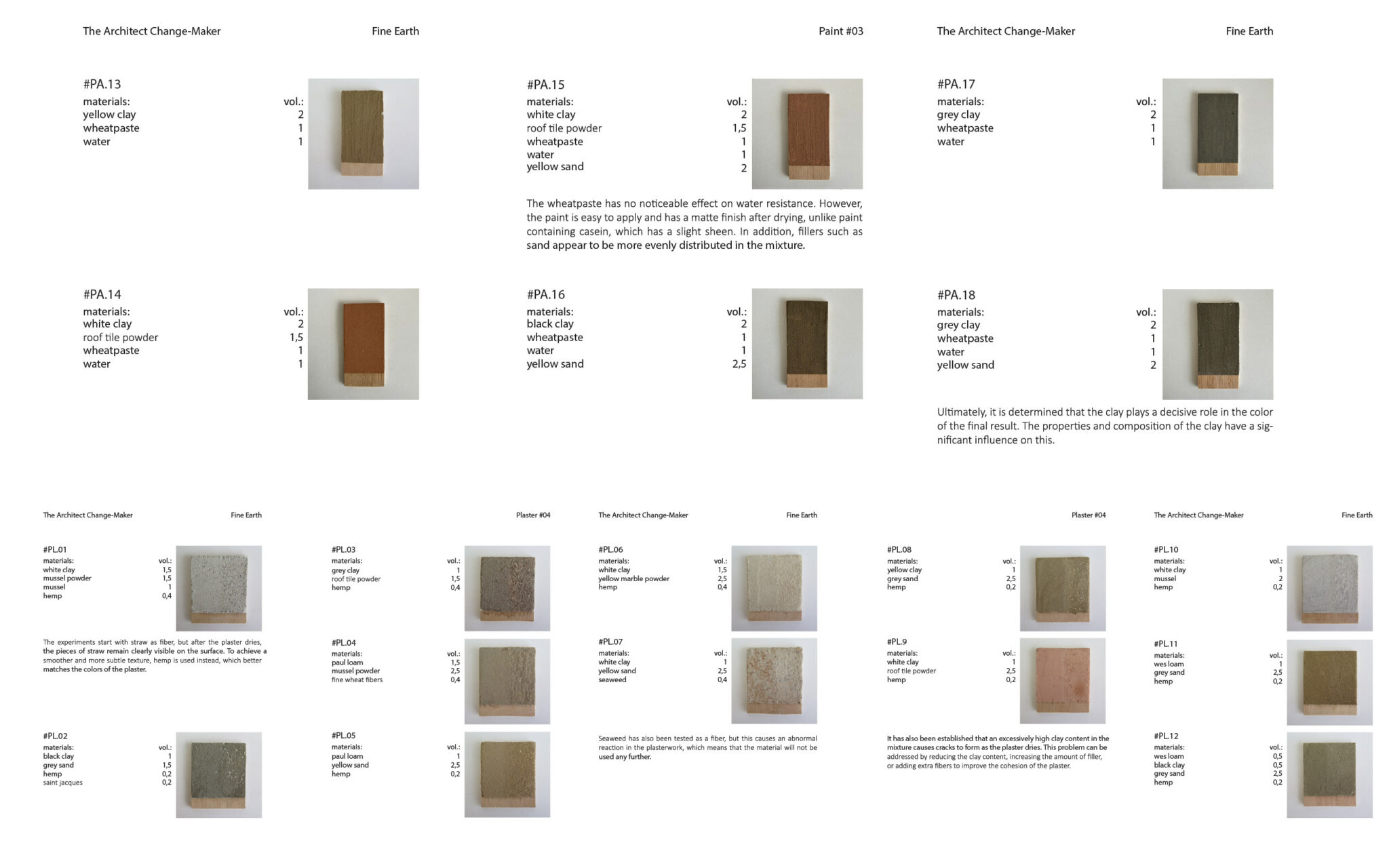 For loam plaster, we tested various ratios of clay, filler, and fibers to achieve optimal cohesion and limit cracking. Alternative fillers (mussel, marble, brick powder) and fibers (seaweed flakes) were also explored, some producing unexpected reactions.