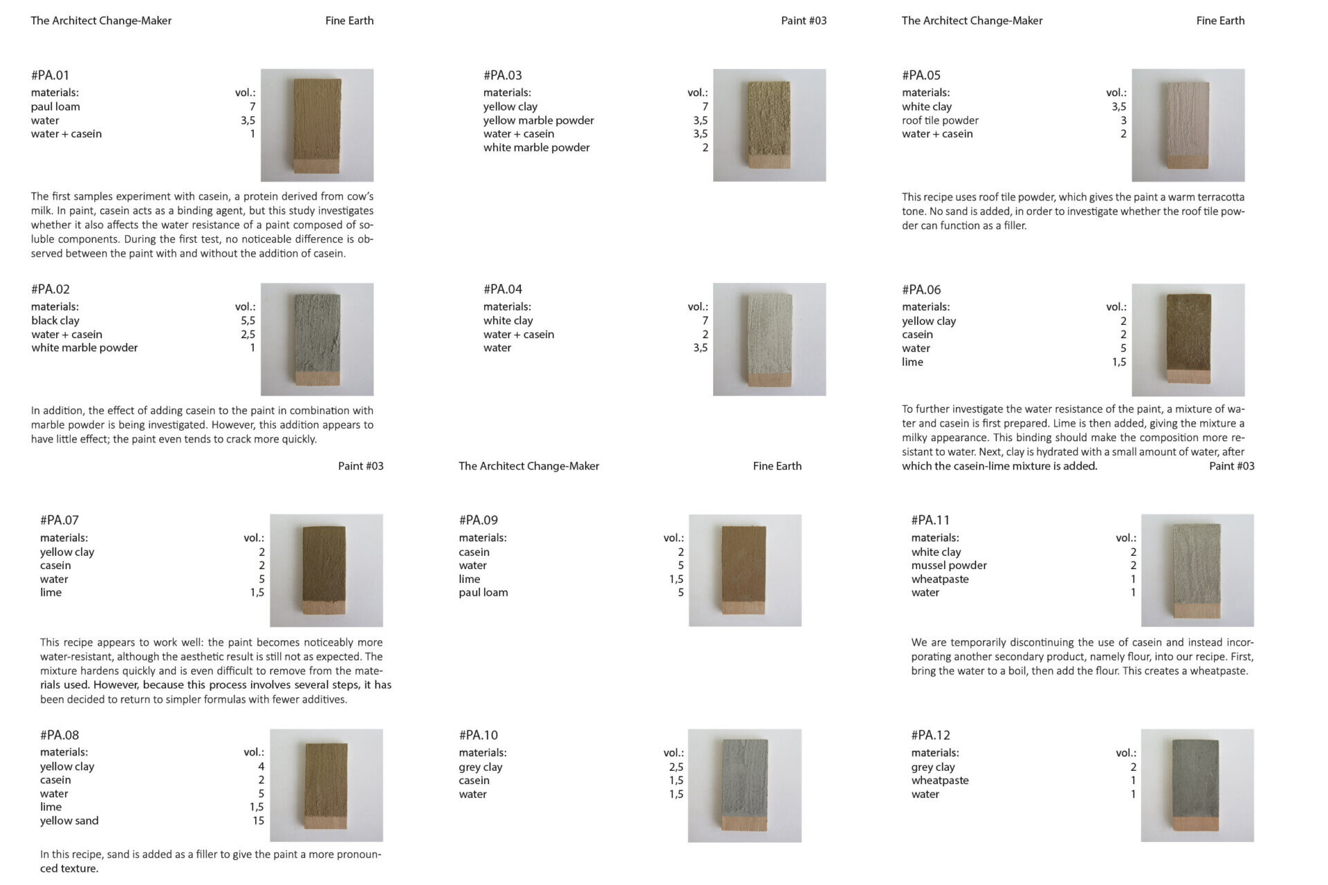 We also tested clay-based paints, experimenting with pigments and additives such as sand and casein to modify texture and water resistance. However, issues such as cracking and loss of material quality led us to discontinue this exploration.