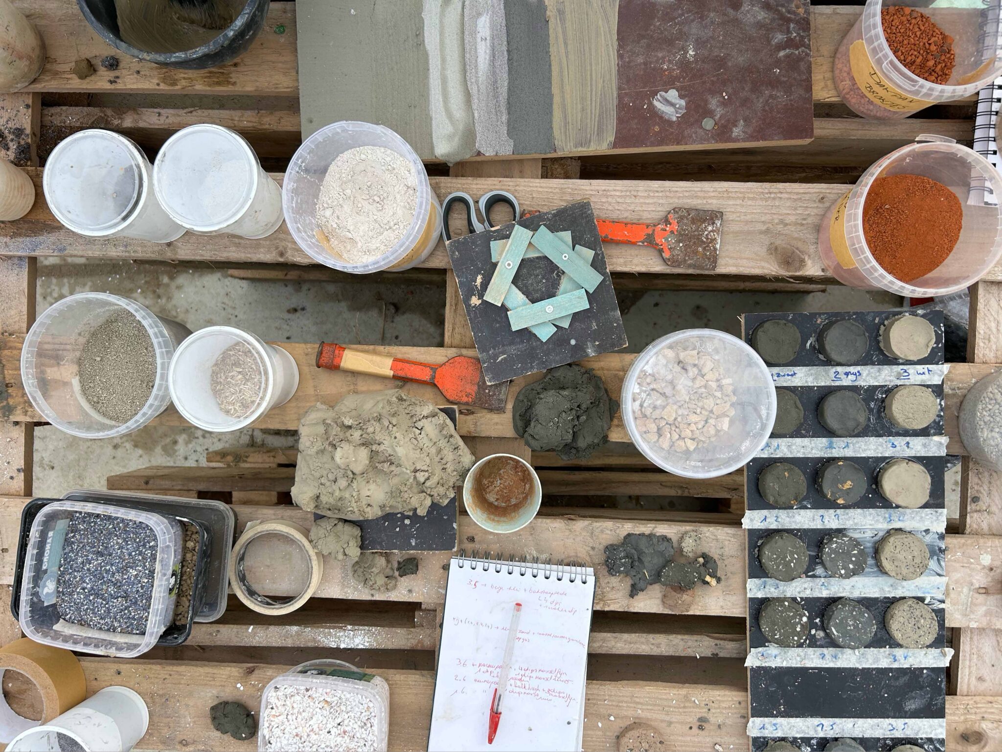 We began by producing terrazzo-style clay tiles, initially using roof tile fragments and shells for contrast, then refining the effect with clay fragments for a subtler finish. After drying, the tiles were sanded to reveal the terrazzo texture.